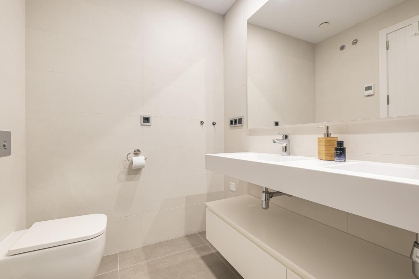 El apartamento tiene 2 dormitorios, una cocina con nevera y lavavajillas, y 2 baños con ducha, secador de pelo y lavadora. Hay toallas y ropa de cama en el apartamento.
